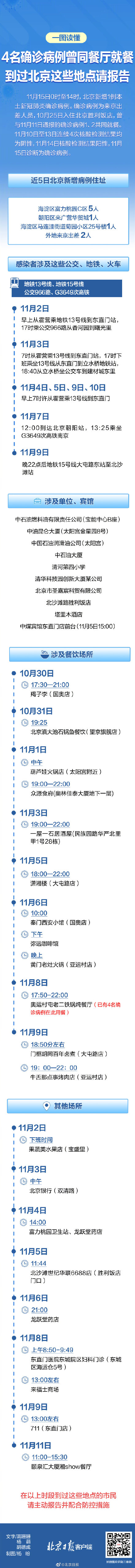確診病例為京出差人員,10月25日入住北京勝利飯店,為11月11日已通報確診病例1、2的密切接觸者,曾與其共同就餐。11月10日作為密切接觸者進(jìn)行集中隔離,11月10日至13日連續(xù)4次核酸檢測結(jié)果均為陰性,11月14日核酸檢測結(jié)果為陽性,已轉(zhuǎn)至定點(diǎn)醫(yī)院隔離治療,綜合流行病史、臨床表現(xiàn)、實(shí)驗室檢測和影像學(xué)檢查等結(jié)果,11月15日診斷為確診病例,臨床分型為輕型。