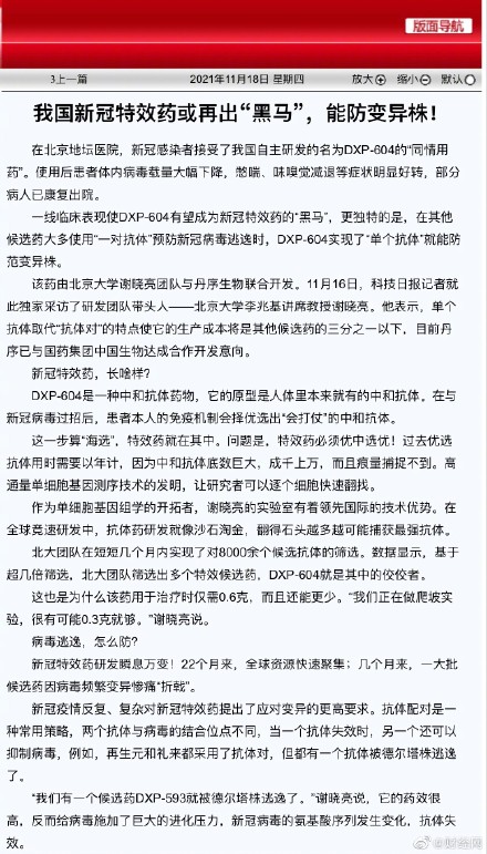 0.6克抗體一針,一針管一個月!在北京地壇醫院,新冠感染者接受了我國自主研發的名為DXP-604的“同情用藥”。使用后患者體內病毒載量大幅下降,憋喘、味嗅覺減退等癥狀明顯好轉,部分病人已康復出院。一線臨床表現使DXP-604有望成為新冠特效藥的“黑馬”,更獨特的是,在其他候選藥大多使用“一對抗體”預防新冠病毒逃逸時,DXP-604實現了“單個抗體”就能防范變異株。