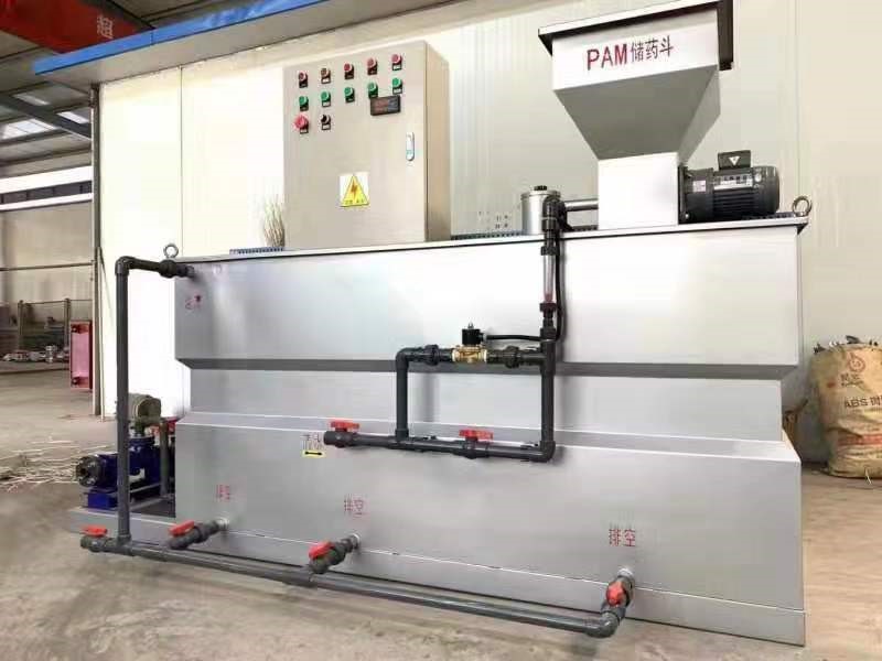 1.料斗中的粉狀藥劑經定量供料裝置送入混合器中,與水進行完全混合后進入溶液箱中,混合液經多級攪拌后形成均一濃度的溶液,最后進入儲液箱內,經計量泵投加至加藥點。