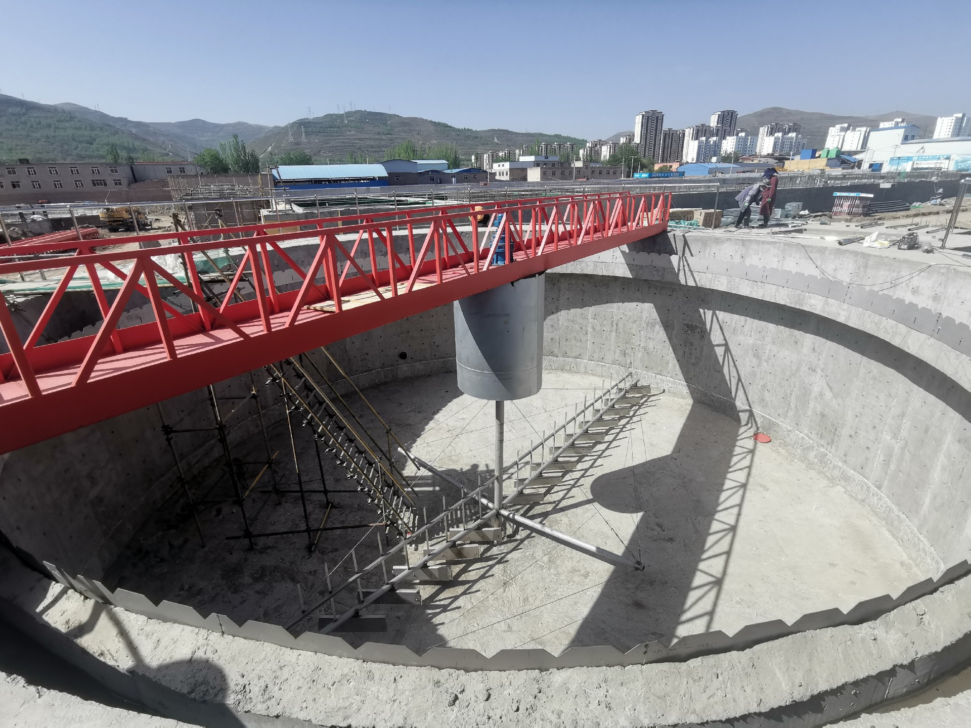 驅動機構推動工作橋沿池平面旋轉,工作橋帶動刮臂旋轉,固定于刮臂上的刮板將泥由池邊逐漸刮至池中心的集泥斗中,刮泥板曲線對數螺旋線性,受力均勻,刮泥徹底,當池底遇有障礙時,能自動提耙,保護機器不受傷害,驅動機構設有扭矩保護裝置,工作更加安全。