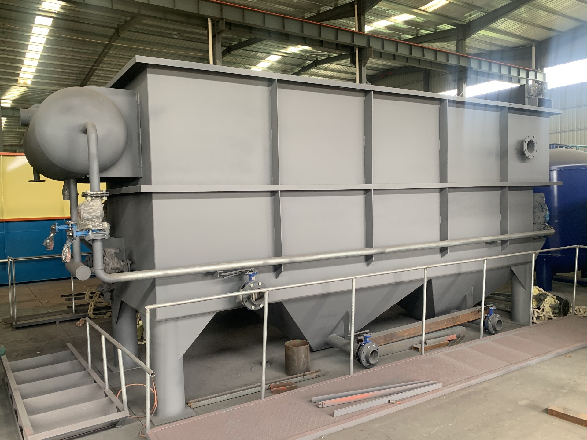 (2)有機物含量較高,采用氣浮沉淀一體機處理,通過加藥攪拌絮凝后,懸浮物通過溶氣水上浮到水面,通過刮渣系統將懸浮物刮出;沉淀物沿斜管下滑到設備底部,由排泥管將沉淀污泥排出;該設備可去除水中懸浮物、沉淀物以及不溶性有機物。