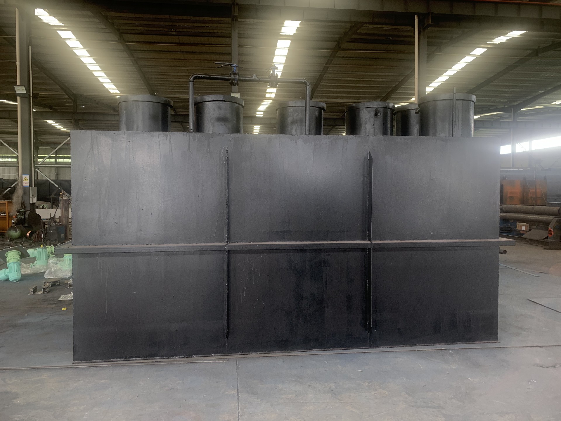 氣浮機出水進入一體化污水處理設備,由水解酸化段、缺氧段、好氧段和二沉池組成。在去除部分污染物的同時,水解酸化段破壞了污水中難降解的有機污染物,提高了廢水的可生化性;缺氧段利用水解酸化池出水中的碳源反硝化脫氮,降低了廢水的總氮含量;好氧段采用微孔曝氣去除COD、BOD等有機污染物和氨氮,、BOD等有機污染物和氨氮,最后將硝化液返回缺氧段前端;有氧段出水在二沉池中分離泥水,污泥返回水解酸化池,剩余污泥排入污泥濃縮池,出水自流至消毒池,通過管道輸送至城市污水處理廠進一步處理。